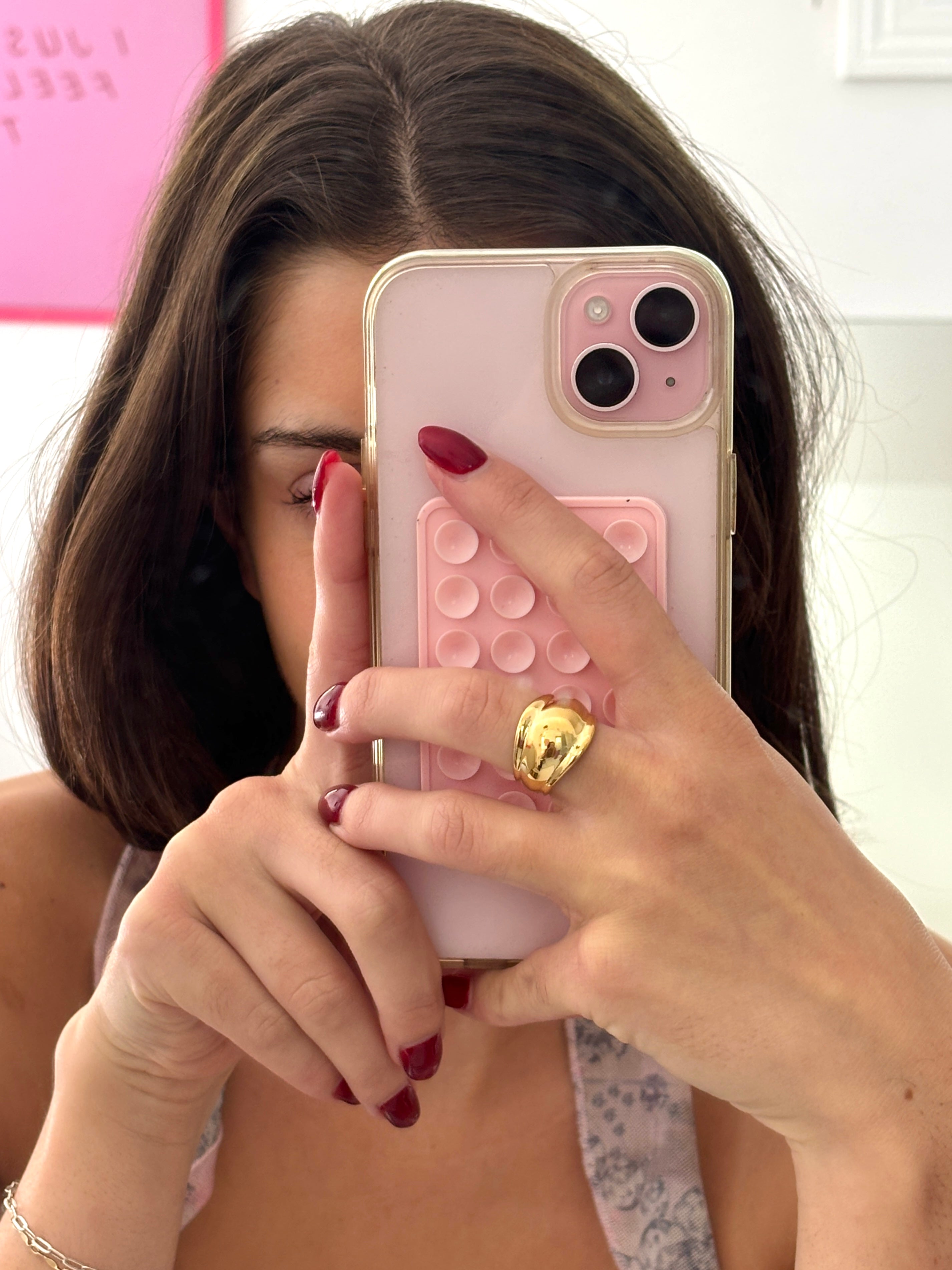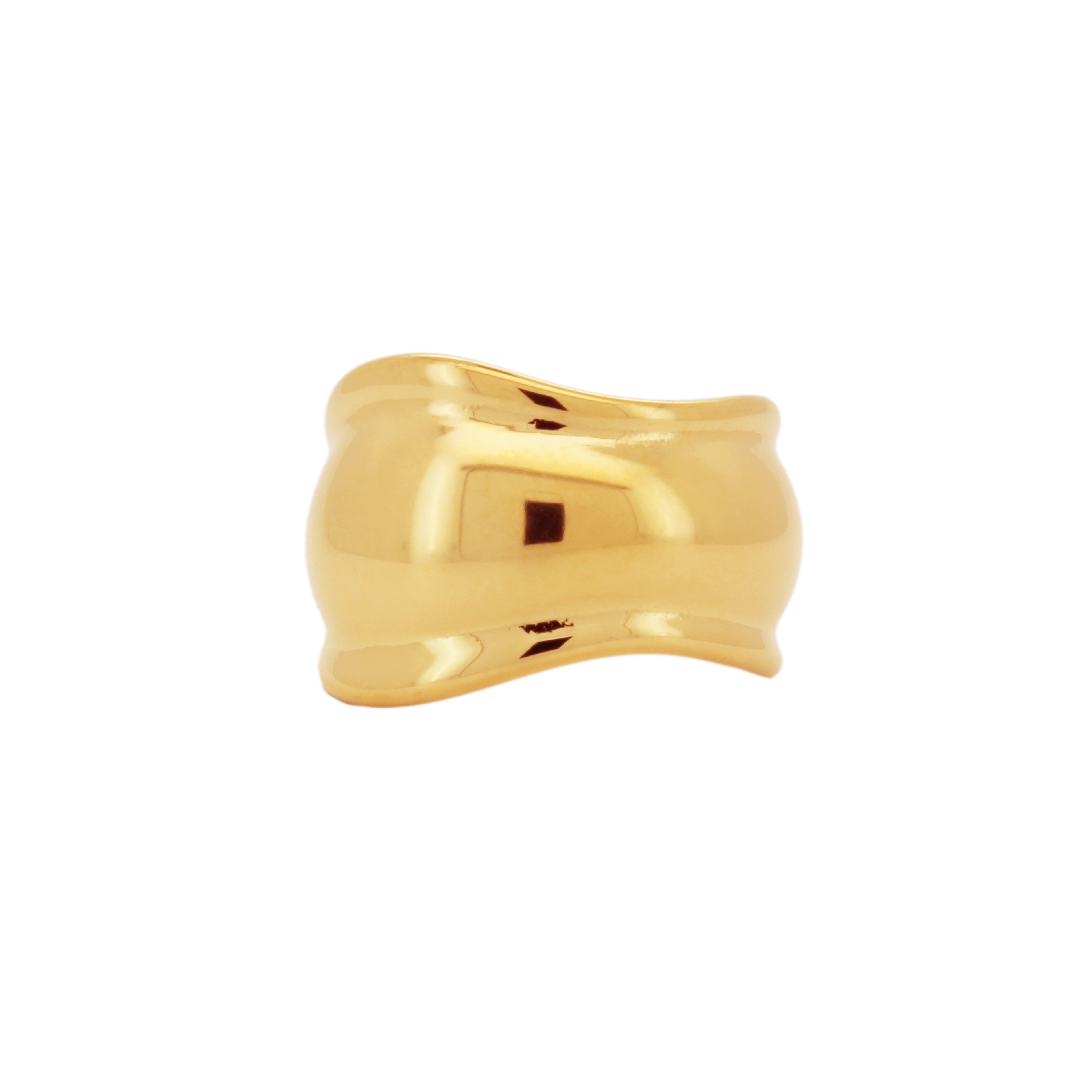 Bold yet fluid, the Bonnie Ring wraps the finger in golden warmth. Its softly sculpted curves catch the light with every movement—elegant on its own or stacked with delicate bands.