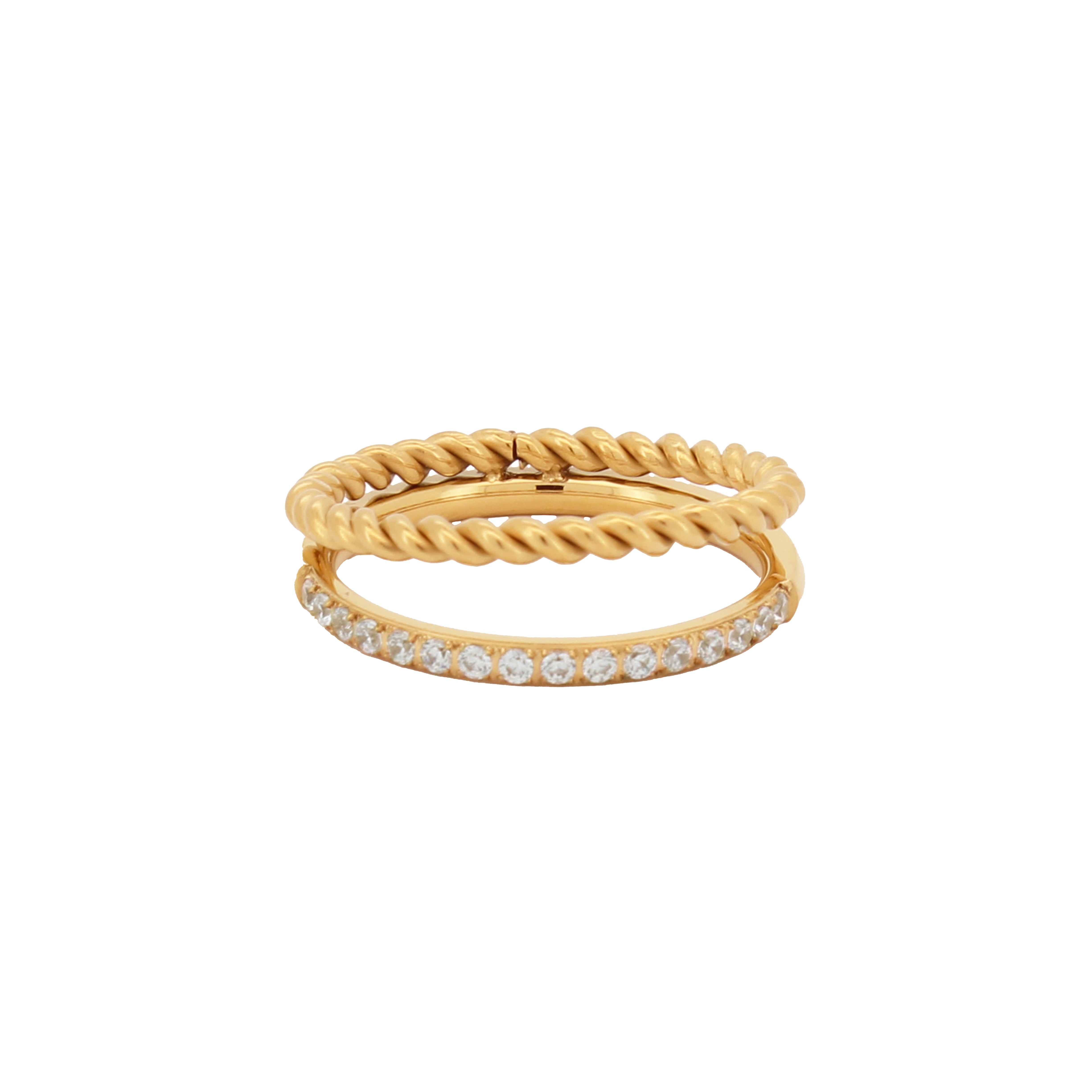 Introducing our Frankie Ring – a masterful creation where simplicity and glamour intertwine. This piece is crafted from 18k Gold Stainless Steel designed to give the appearance of two distinct rings in one.