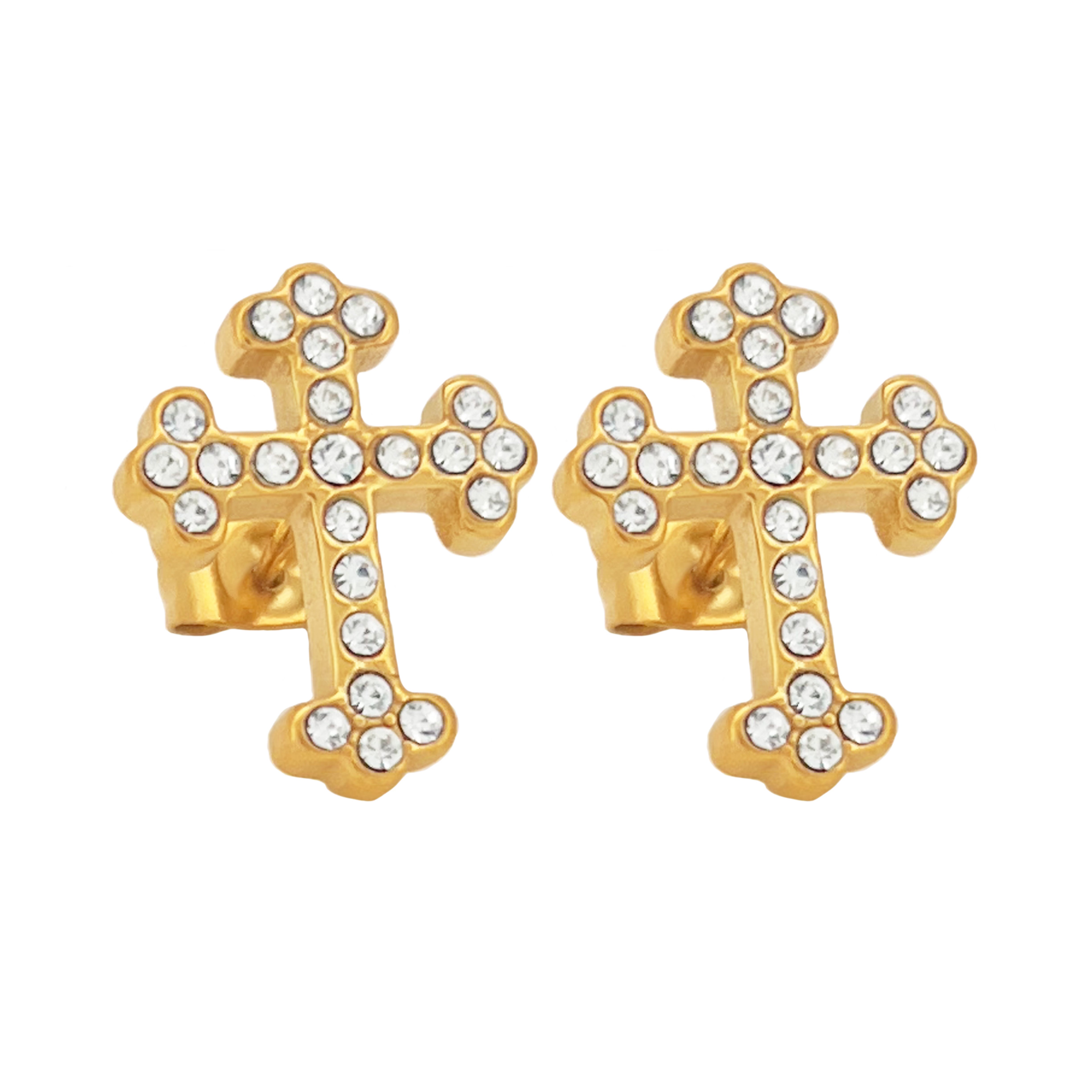 Introducing our Anastasia Cross Studs – a stunning blend of classic design and modern elegance. These statement earrings feature a bold cross shape, beautifully adorned with crystals paved along the centre.