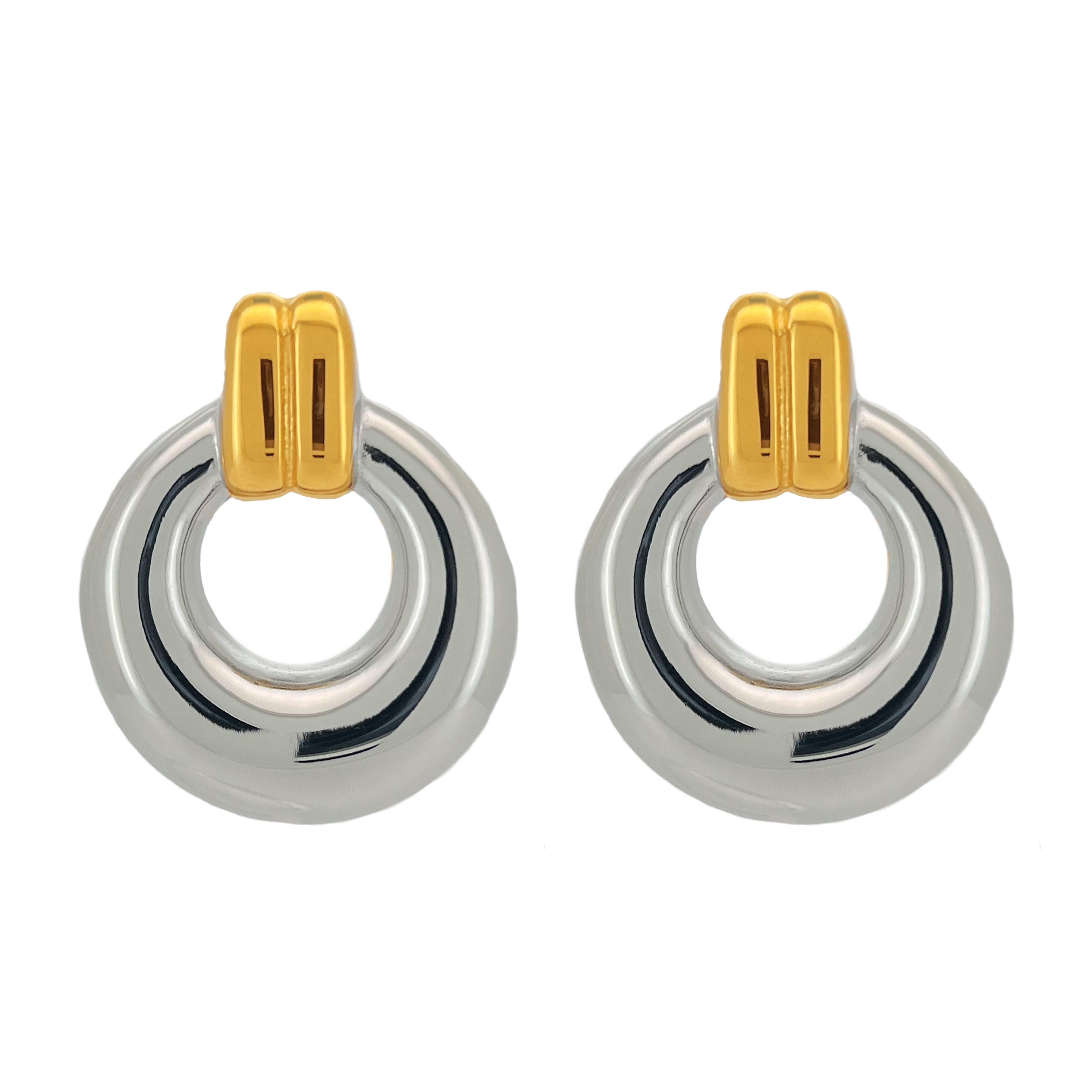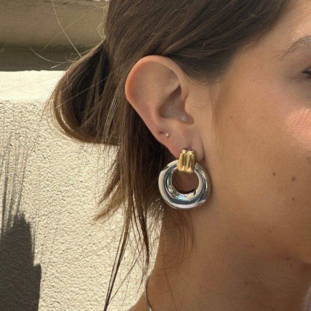Introducing the Coraline Earrings - featuring a chic two-toned design with a polished silver-tone circular hoop complemented by a sleek gold accent at the top. Their unique blend of silver and gold tones adds versatility, making these earrings a perfect match for any jewelry collection. With a modern yet timeless style, the Coraline Earrings are ideal for elevating both casual and formal looks.