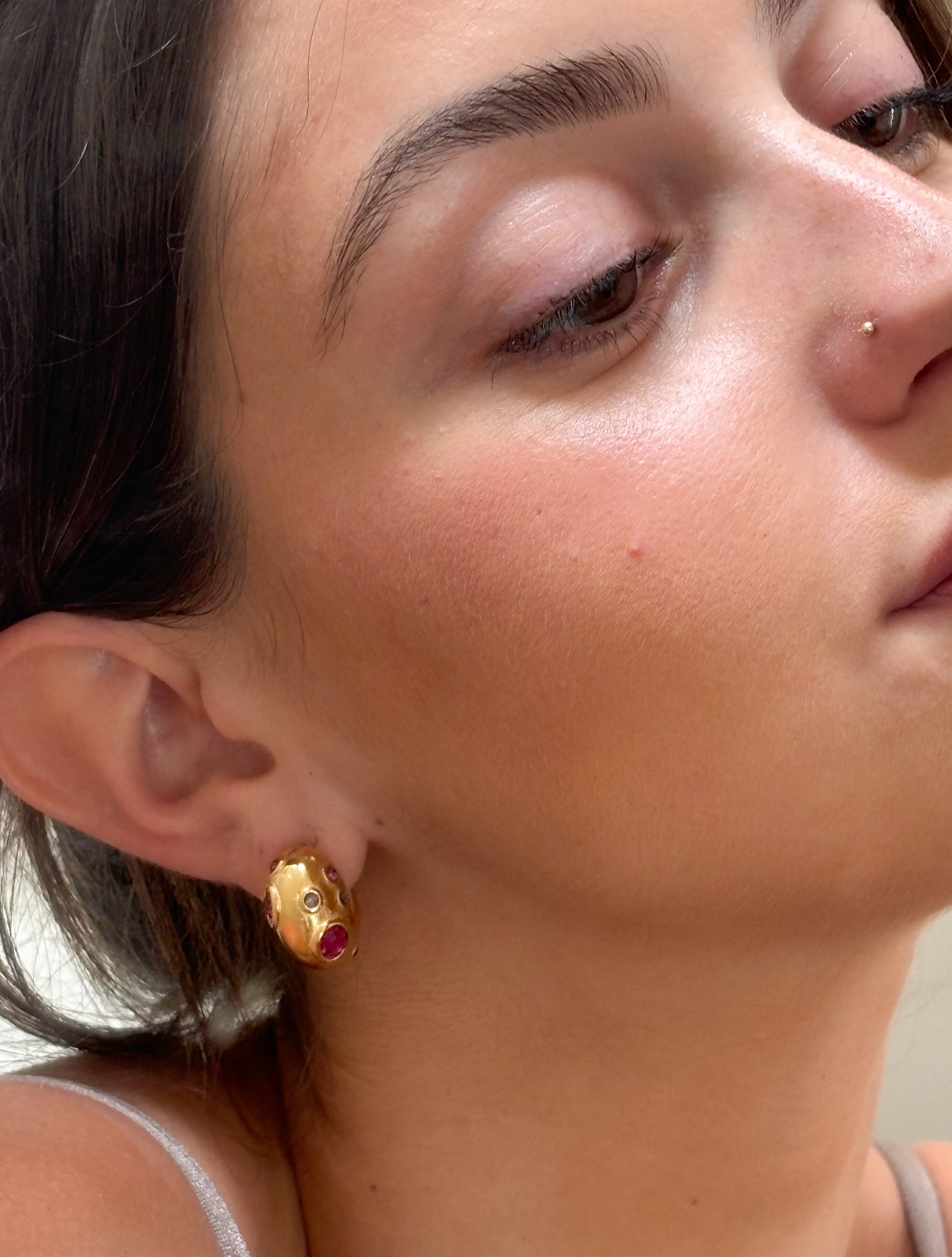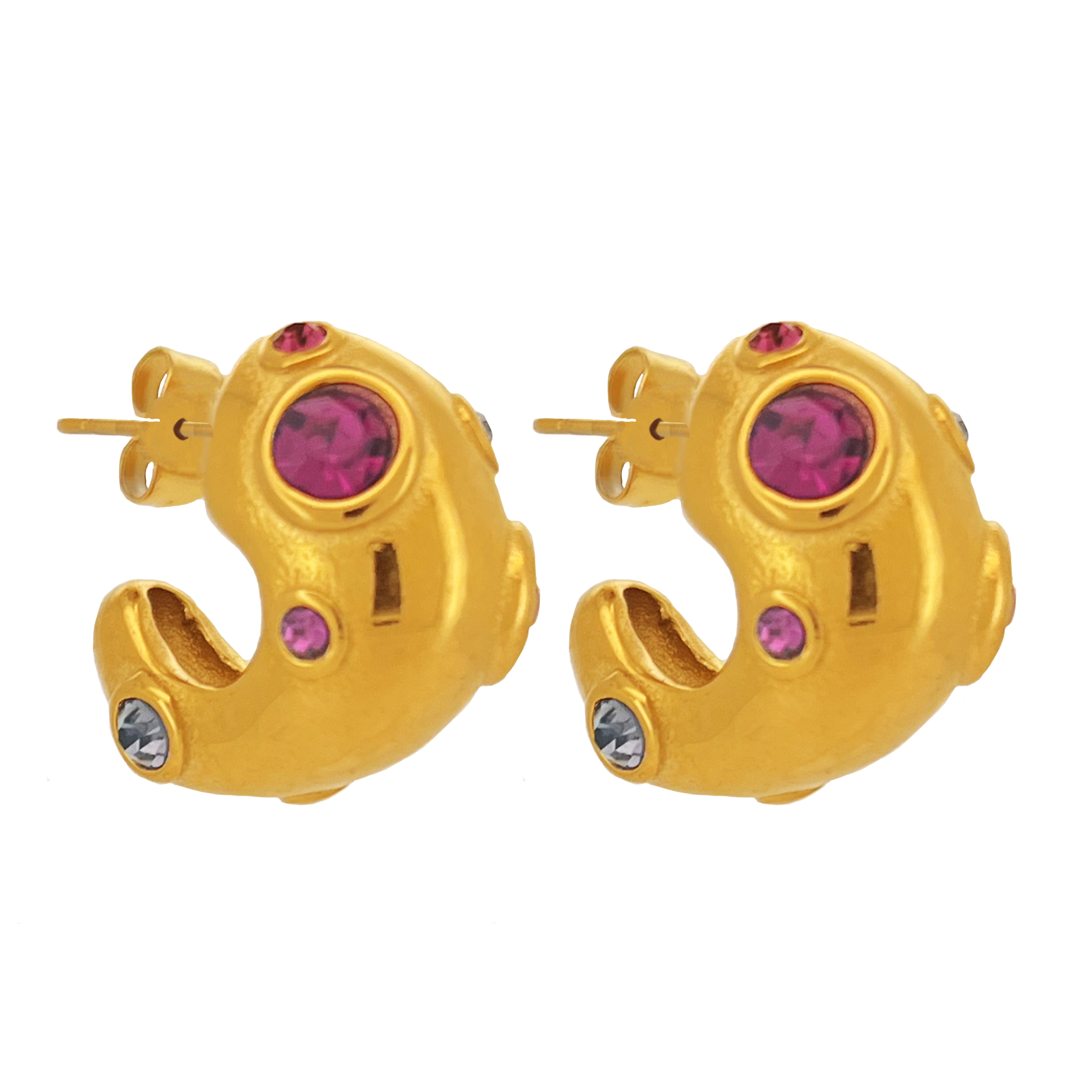 Introducing the Jordy Earrings- these bring a vibrant and whimsical touch to classic gold-tone earrings. Featuring a chunky crescent shape adorned with multicoloured gemstones, including bold pink and sparkling blue accents, these hoops are designed to stand out. Their playful yet elegant design makes them perfect for adding a fun pop of colour to any outfit.