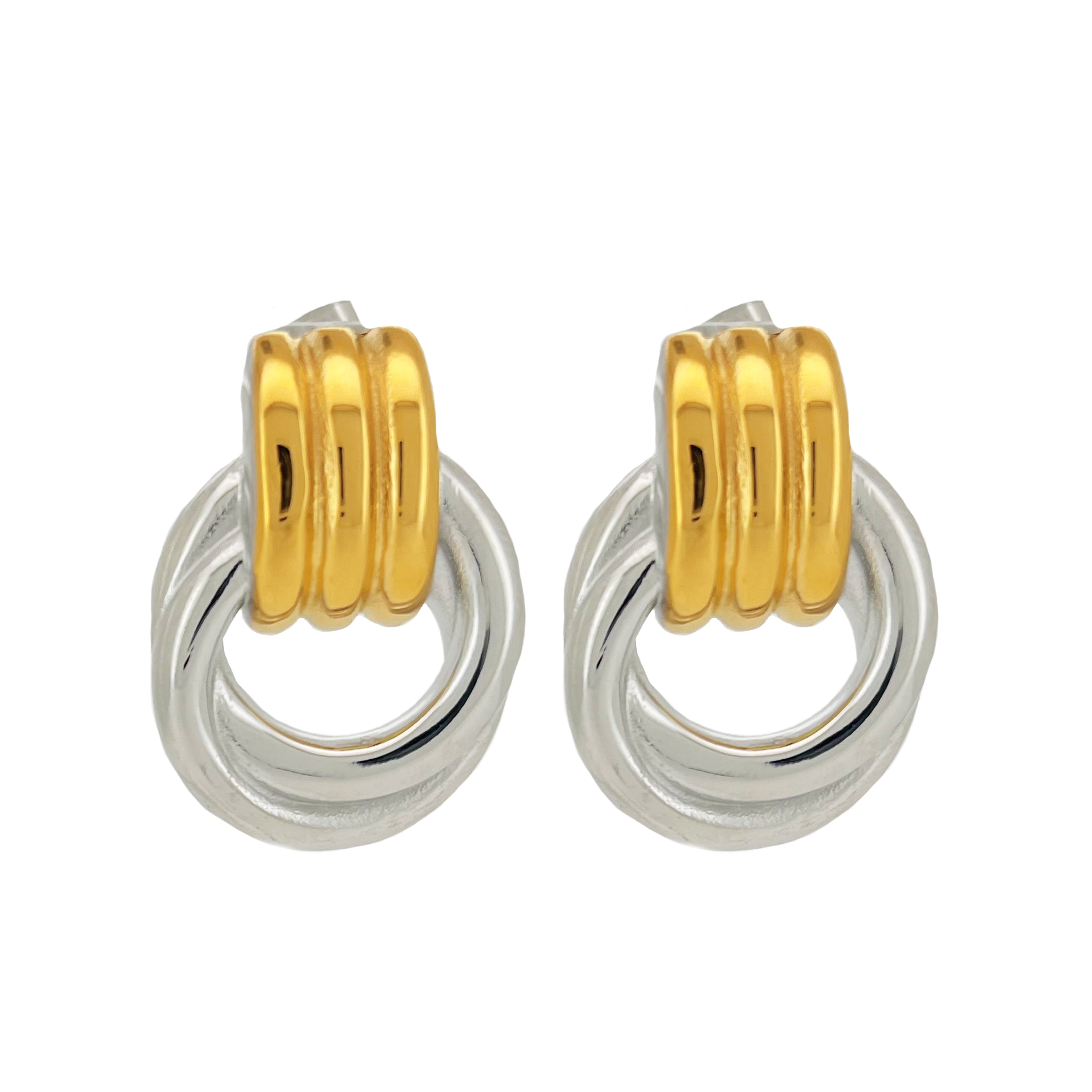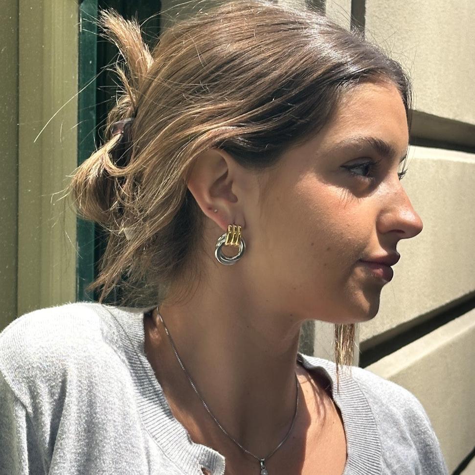 Introducing our Leo Earrings - These two-toned earrings bring a modern twist to a classic knot design. Featuring a polished silver-tone base twisted into an open circular shape, topped with three sleek gold-tone bars, these earrings offer the perfect balance between bold and refined. Their versatile look makes them ideal for adding a touch of elegance to any outfit.