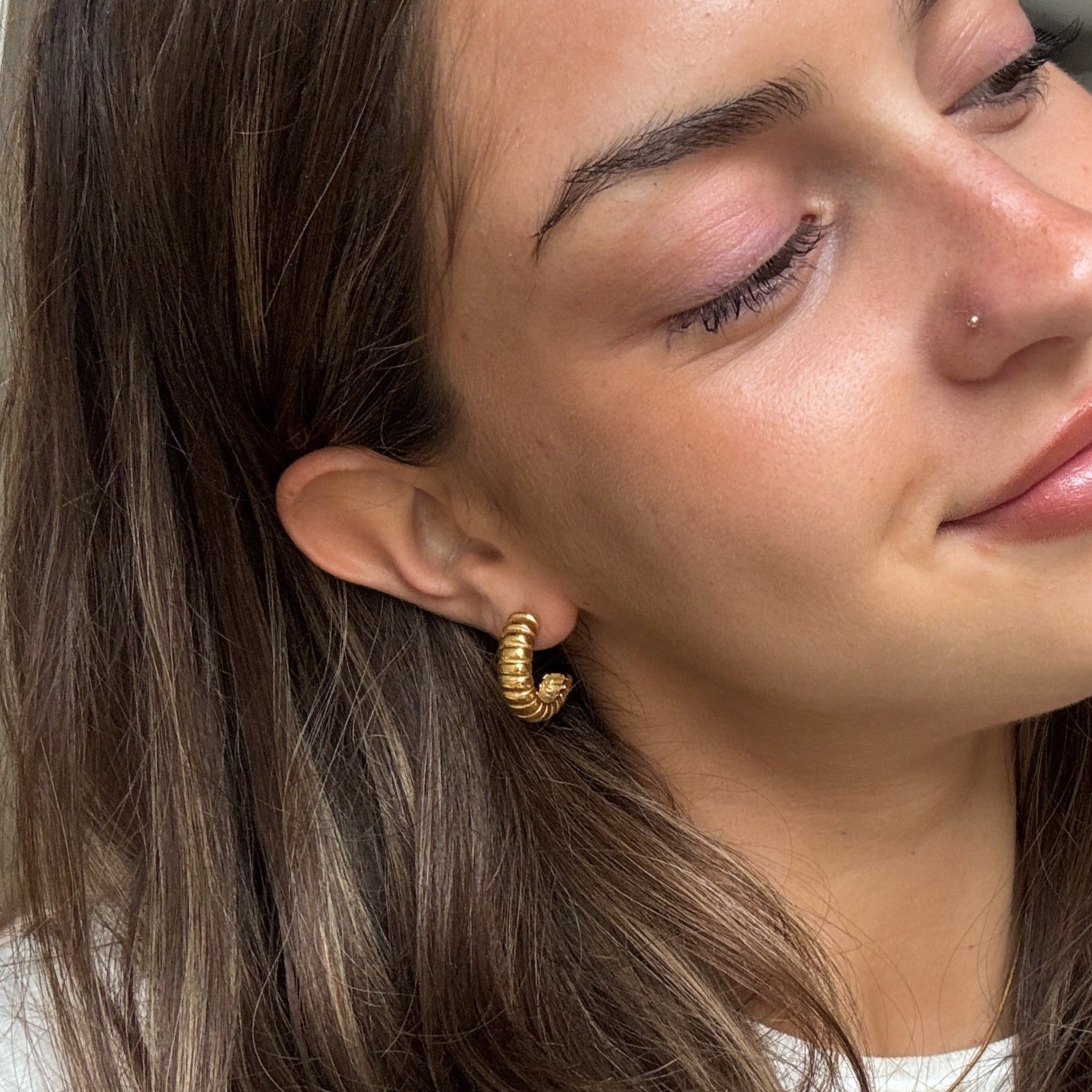 Introducing our Nova Hoops – a timeless staple for any jewellery collection. Crafted from 18k Gold Stainless Steel, these hoops feature a stylish ribbed texture, adding a touch of sophistication to their classic design. Perfect for everyday wear or special occasions, these earrings combine durability with elegance for a versatile accessory you’ll reach for time and time again.