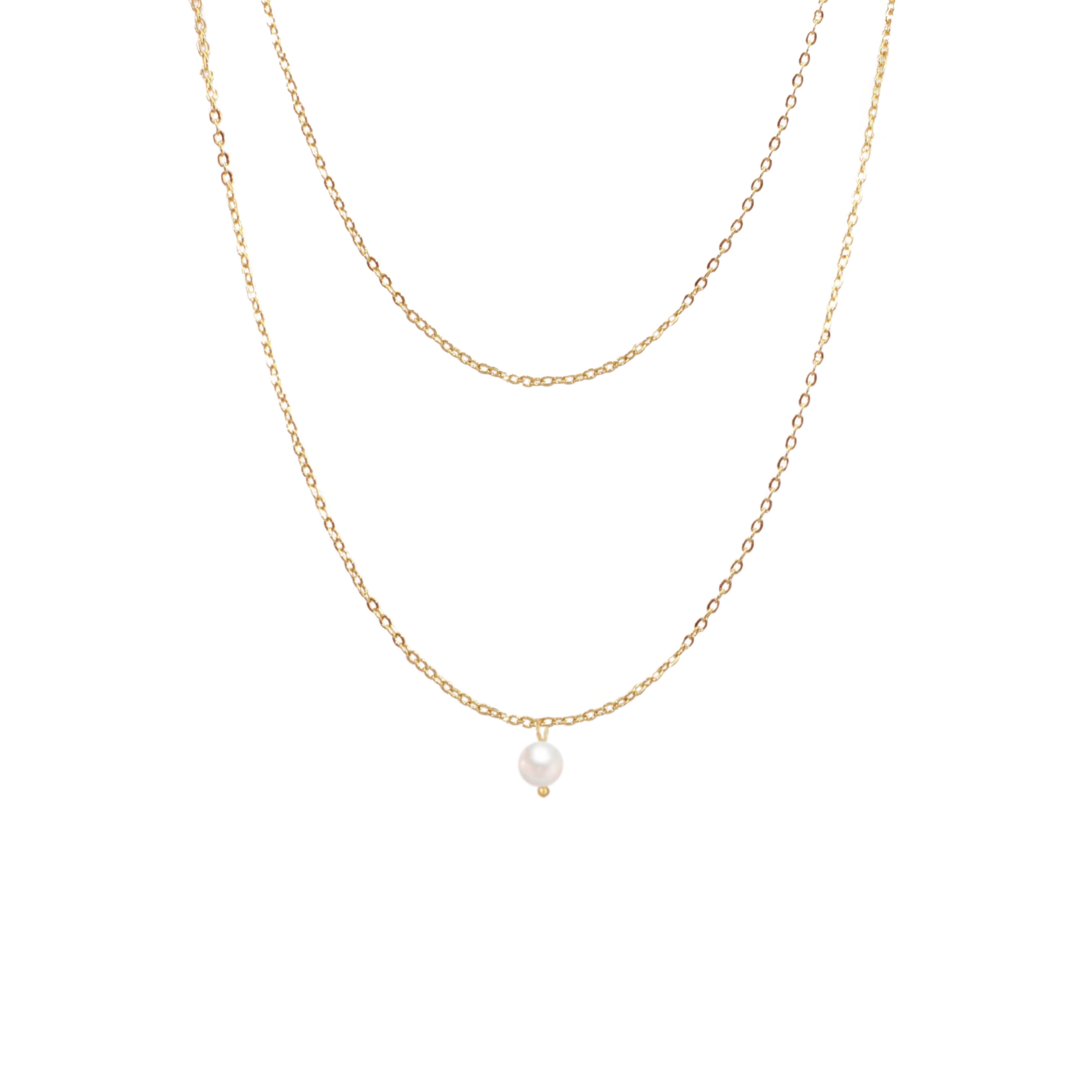 Introducing our Lily Pearl Necklace – a blend of simplicity and sophistication. This piece features a single, luminous round pearl gracefully suspended on a dainty cable chain, paired with a shorter, plain cable chain above for an effortlessly layered look.