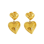 Introducing our Heart Earrings. Crafted from 18k Gold Stainless Steel, each earring features a dainty gold heart from which a larger heart gracefully dangles. The design speaks of romance with a whisper of playfulness, capturing the gentle and bold facets of the heart's journey. A timeless adornment for the ears, these earrings are a testament to love's enduring form.