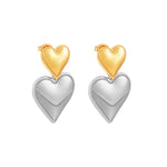 Introducing our Heart Earrings. The harmonious blend of silver and gold with our Dual-Toned Heart Earrings. Crafted from 18k Gold Stainless Steel, each earring features a dainty gold heart from which a larger silver heart gracefully dangles. This unique design not only adds depth and dimension but also allows for effortless matching with both silver and gold accessories. Perfect for those who appreciate the versatility of mixed metals, these earrings elegantly unite two timeless tones into one exquisite piece.