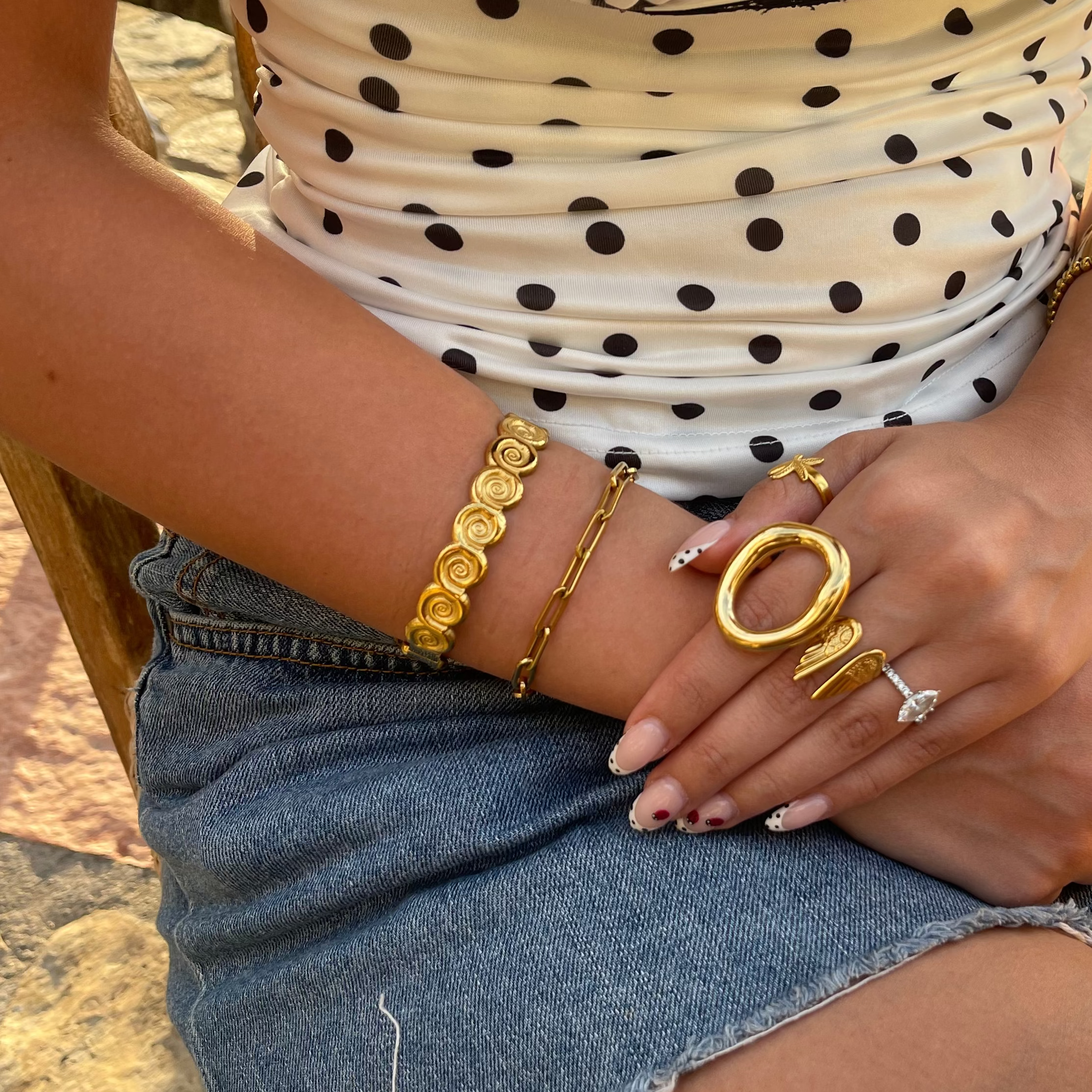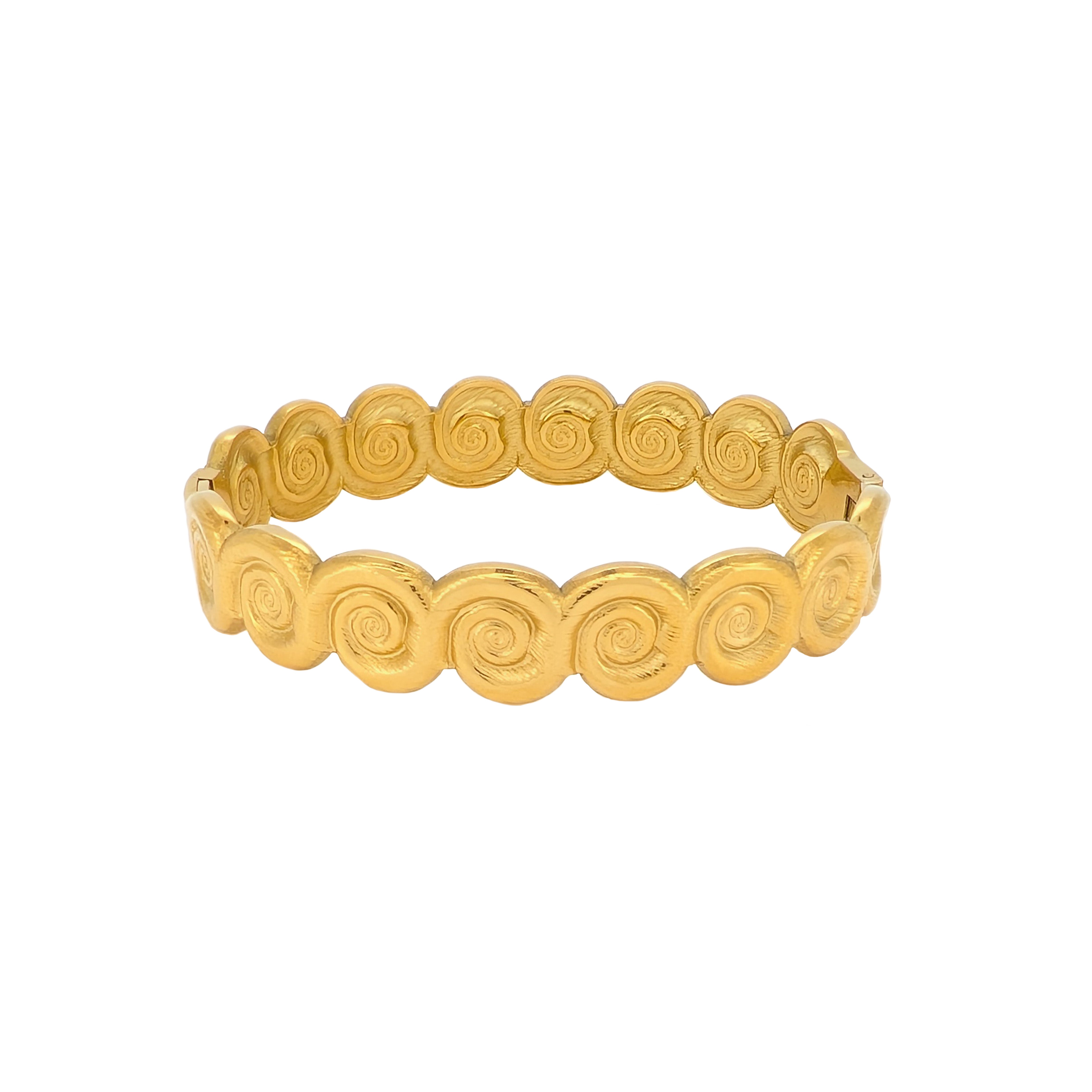 A touch of heritage with radiant charm: our Spira Bracelet is a modern nod to ancient Greek motifs. With golden spirals linked in harmony, it slips on with ease and shines beautifully alone or stacked with your everyday favourites.